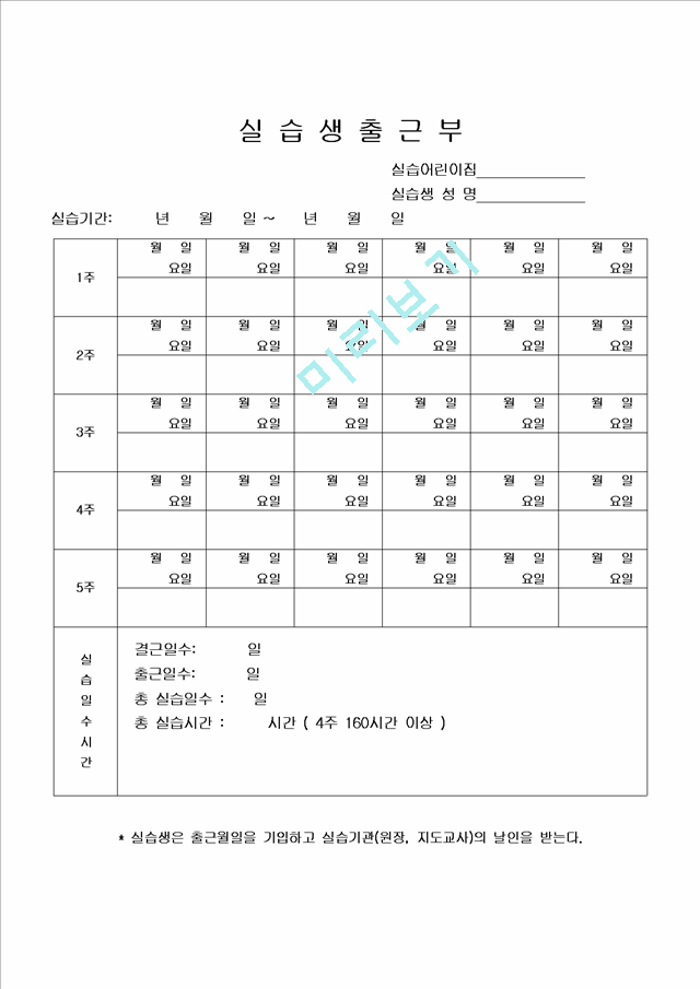 * 실습생은 출근월일을 기입하고 실습기관(원장, 지도교사)의 날인을 받는다.